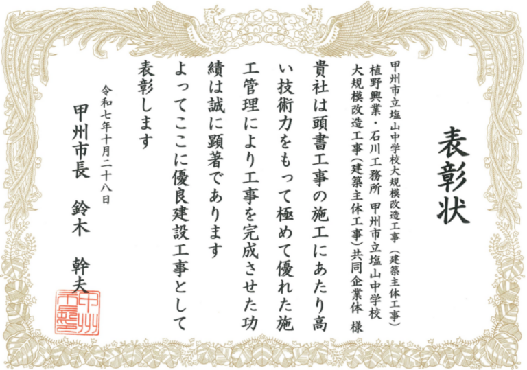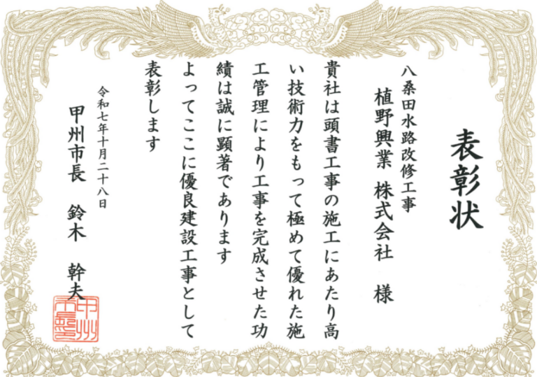 受賞名:令和6年度完成 甲州市優良建設工事表彰